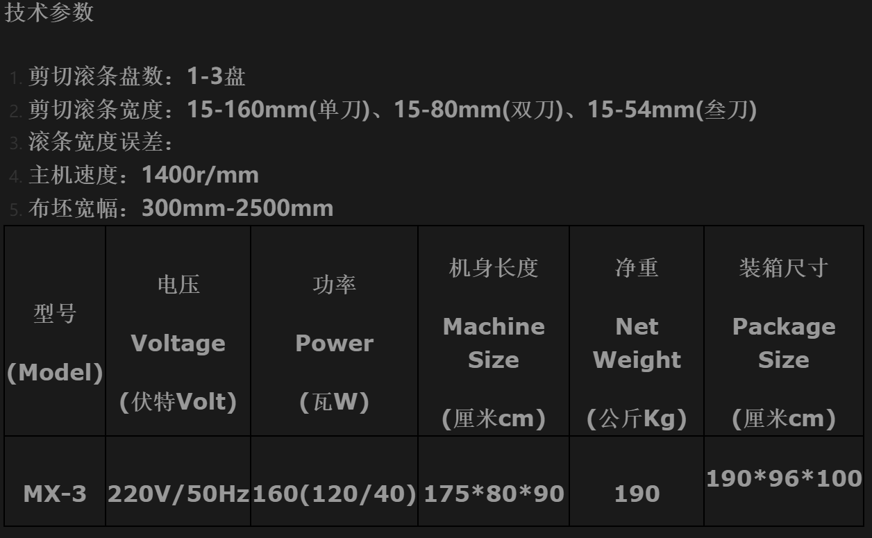 采用無級調(diào)速系統(tǒng),解決了彈力大的各種圓筒織布坯料在剪切條時的技術(shù)缺陷,使所切條的尺寸更標準,操作方便